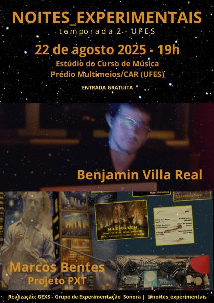 NEx - Noites Experimentais é um evento destinado à música experimental e afins. Esta quinta edição de 2025 contará com a participação dos artistas locais Benjamin Villa Real e Marcos Bentes apresentando suas obras.